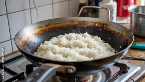 A close-up photograph of steaming white rice in a worn-out black wok on a stovetop