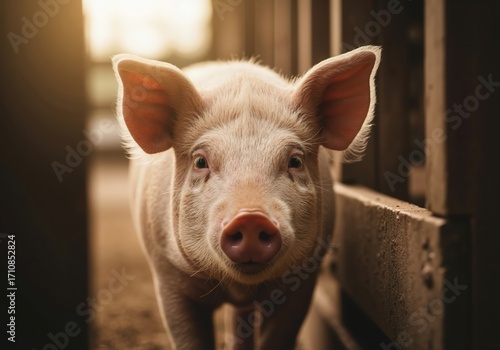 A close-up portrait of a cute piglet on a farm. Young domestic pig in a barn looking at the camera. Agriculture and livestock concept with warm light