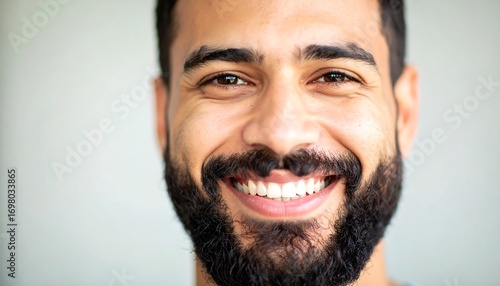 A close-up portrait of a man with a joyful expression, showcasing a wide smile and a well-groomed beard against a neutral backdrop. His eyes and mouth convey happiness and enthusiasm.