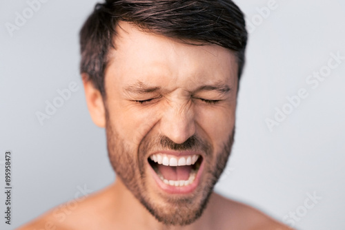 A close-up portrait of a man with dark hair and a beard, shouting with his eyes closed, captured against a light gray background.