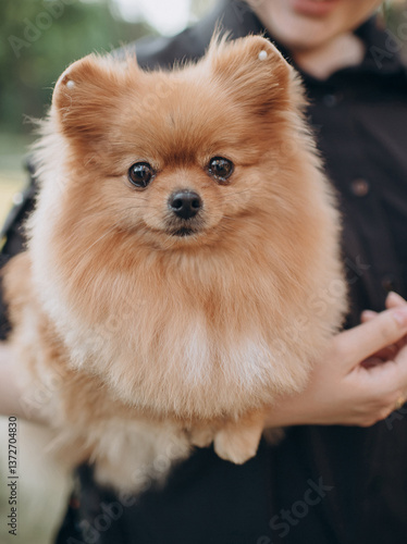 A close-up portrait of a red spitz being held under the arm by its owner. The dog looks calm and comfortable, with its fluffy coat and alert expression