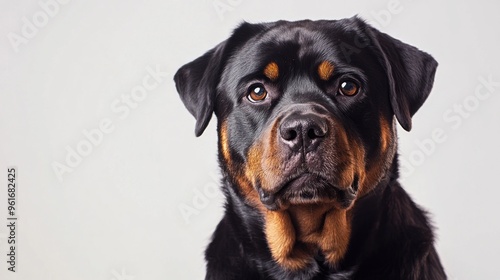 A close-up portrait of a Rottweiler with expressive eyes against a neutral background.