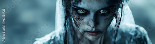 A Close-Up Portrait of a Woman with Zombie Makeup, Her Eyes Glowing Bright Yellow in a Dark and Moody Setting