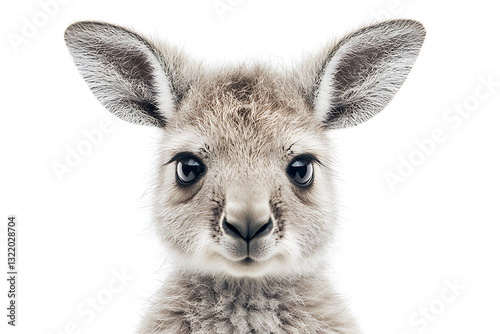 A close-up portrait of a young kangaroo with fluffy fur and large expressive eyes against a white background.