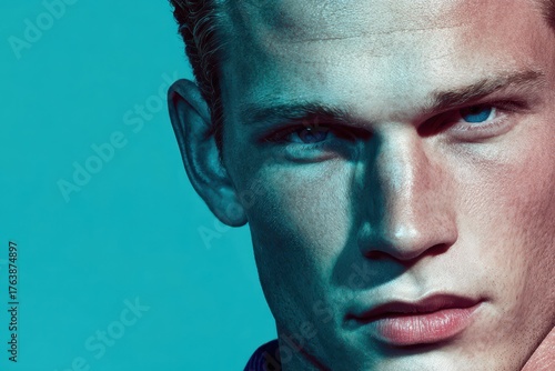 A close-up portrait of a young man's face, illuminated by blue and pink light, showing his features and clear blue eyes with a determined look against a turquoise background.