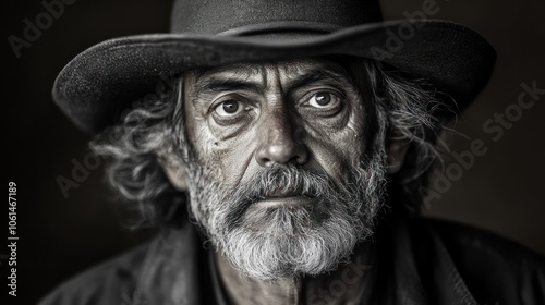 A close-up portrait of an older man with a rugged appearance and a wide-brimmed hat.