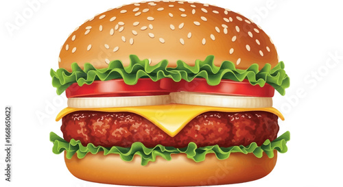 A close-up, realistic illustration of a delicious, juicy beef burger with all the fixings, including lettuce, tomato, onion, and cheese