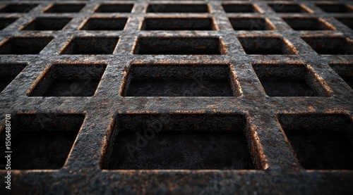 A close-up reveals a dark, rusted metal grate with square openings, creating a repeating grid pattern; perspective subtly distorts the squares towards the background