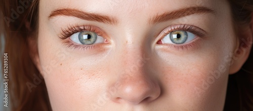 A closeup selfie of a womans face with electric blue eyes and jaw, red hair, and a captivating smile. Her detailed nose, long eyelashes, and green iris shine in the macro photography
