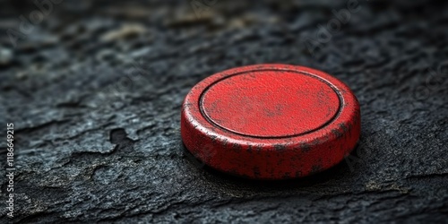 A close-up shot of a bright red button situated on a dark black surface