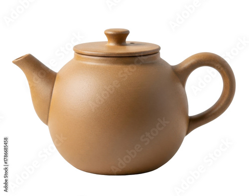 A close-up shot of a brown ceramic teapot with a lid and a handle, isolated on white.