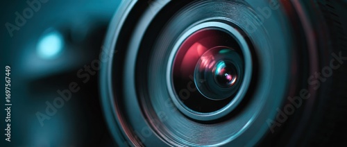 A close-up shot of a camera lens with a red and white reflection, and blue tones