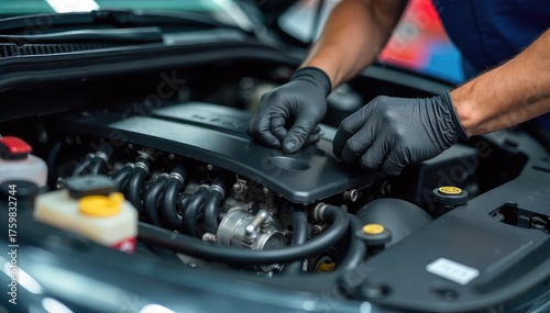 A close-up shot of a car engine undergoing meticulous maintenance, highlighting various tools and components , automotive, hose