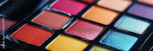 A close-up shot of a colorful makeup palette with a mirror reflection. The palette is filled with various shades of eyeshadows, perfect for creating a variety of looks. The image is perfect for makeup