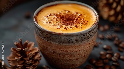 A close-up shot of a cup of coffee topped with foam and cinnamon.