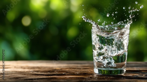 A close-up shot of a glass filled with clear water splashing, set against a blurred green natural background that emphasizes freshness and vitality of life around it.