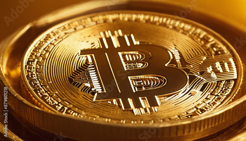 A close-up shot of a gold bitcoin coin, showcasing the intricate design and detail of the cryptocurrency
