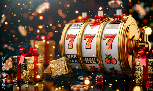 A close-up shot of a golden slot machine with triple sevens, surrounded by festive gifts and sparkling lights