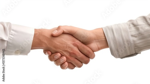 A close-up shot of a male and female lawyer shaking hands, smiling and looking confident, against a neutral white background, emphasizing their partnership and agreement.