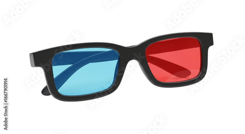 A close-up shot of a pair of 3D glasses with red and blue lenses, isolated on white.