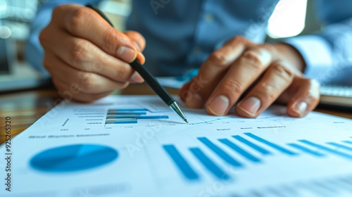 A close-up shot of a person's hand using a pen to point at a graph on a financial document, ideal for business presentations, financial reports, and marketing materials,