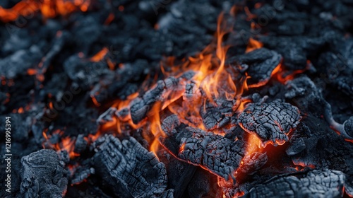 A close-up shot of a pile of charcoal burning with intense flames