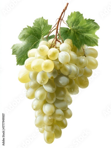 A close-up shot of a ripe bunch of grapes, with verdant green leaves. The succulent grapes, glistening with freshness, suggest a taste of sweetness.