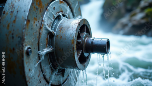 A close-up shot of a rusty water wheel or turbine, representing sustainable green energy.