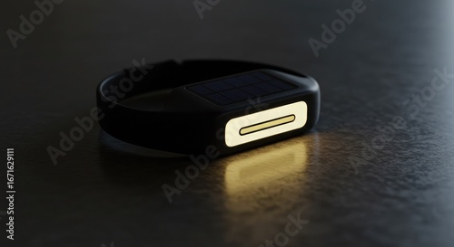 A close-up shot of a sleek black wearable device with a glowing golden light on a dark, reflective surface, highlighting its modern design.