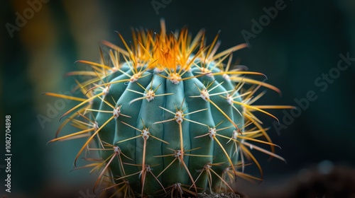 A close-up shot of a spiky green cactus with orange spines, growing in a pot, against a blurred background.