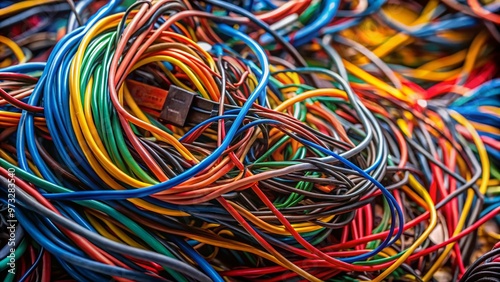 A close-up shot of a tangled mess of colorful electrical wires, cables, and connectors against a dark background, highlighting complexity and chaos in technology.