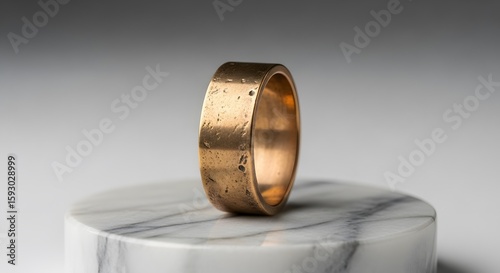 A close-up shot of a textured gold ring stands on a marble pedestal against a soft gray background showcasing its unique surface and elegant simplicity.