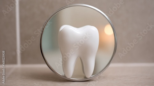 A close-up shot of a tooth in a circular mirror. The tooth is perfectly white and clean, reflecting health and hygiene. The image is simple yet striking, highlighting the importance of dental care