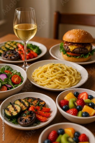 A close-up shot of a variety of fresh and colorful food dishes elegantly arranged on a dining table.