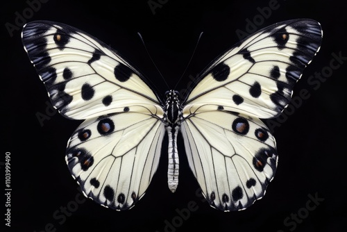 A close-up shot of a white butterfly with distinctive black spots on its wings