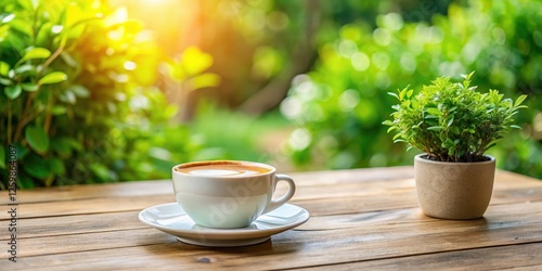 A close-up shot of a white cup of coffee on a wooden table with small trees and green leaves in a vase , greenery, tree, greenery