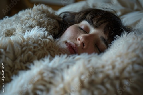 A close-up shot of a woman sleeping peacefully, her face partially obscured by a fluffy blanket
