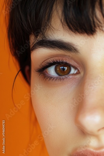 A close-up shot of a woman's eye on a bright yellow background