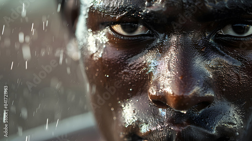 A close-up shot of an African male track and field runner with black skin. sweat running down his face