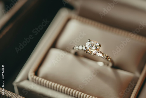 A close-up shot of an elegant engagement ring featuring a brilliant cut diamond, nestled in a plush, beige box, symbolizing love and commitment.