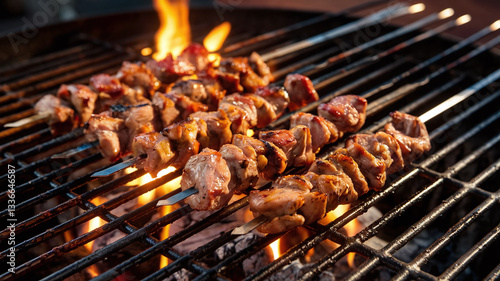 A close-up shot of juicy, perfectly grilled meat skewers sizzling on a charcoal barbecue with mild flames and smoke, creating a mouthwatering, smoky, and delicious BBQ scene.