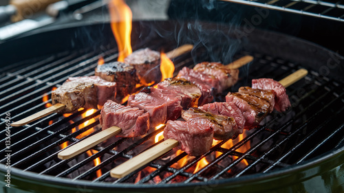 A close-up shot of juicy, perfectly grilled meat skewers sizzling on a charcoal barbecue with mild flames and smoke, creating a mouthwatering, smoky, and delicious BBQ scene.