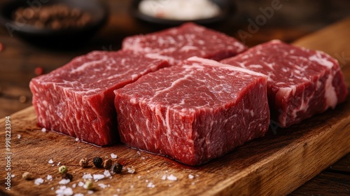 A close-up shot of marbled beef cuts on a wooden cutting board, highlighting the quality and texture of the meat, perfect for steak enthusiasts and chefs.