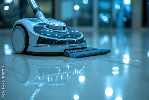 A close-up shot of modern cleaning equipment, including a high-tech vacuum cleaner, mop, and automatic floor scrubber, placed on a glossy tiled floor.