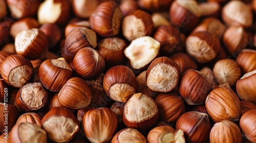 A close-up shot of numerous hazelnuts with both intact shells and exposed kernels, highlighting their rich color, texture, and natural arrangement in a visually appealing composition.