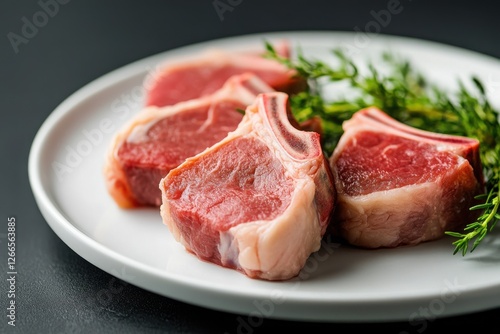 A close-up shot of raw lamb chops arranged on a clean white plate, surrounded by delicate herbs and set against a stark black background.