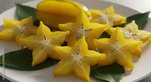 A close-up shot of star fruit slices arranged on a white plate for serving.