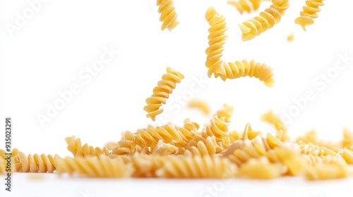 A close-up shot of uncooked, dry, spiral-shaped pasta falling onto a pile of the same type of pasta on a white background.