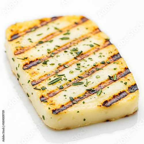 A close-up shot showcases a perfectly grilled halloumi cheese, displaying enticing grill marks and a sprinkle of fresh herbs, ready to tantalize the taste buds.
