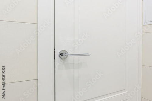 A close-up shows a white door with a chrome handle, set against tiled walls